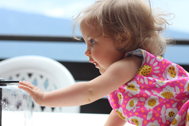 La petite fille et le ballon, quelques centimètres de profondeur sinon c'est trop, sinon elle n'aime pas... Pas trop d'éclaboussure, du bleu turquoise : un petit lac à son échelle.